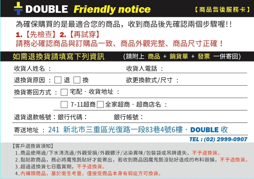 ※貼心提醒:如因個人因素導致退貨或未領次數過多,DOUBLE網路服務即會直接停權,煩請見諒,日後可直接於實體門市選購。